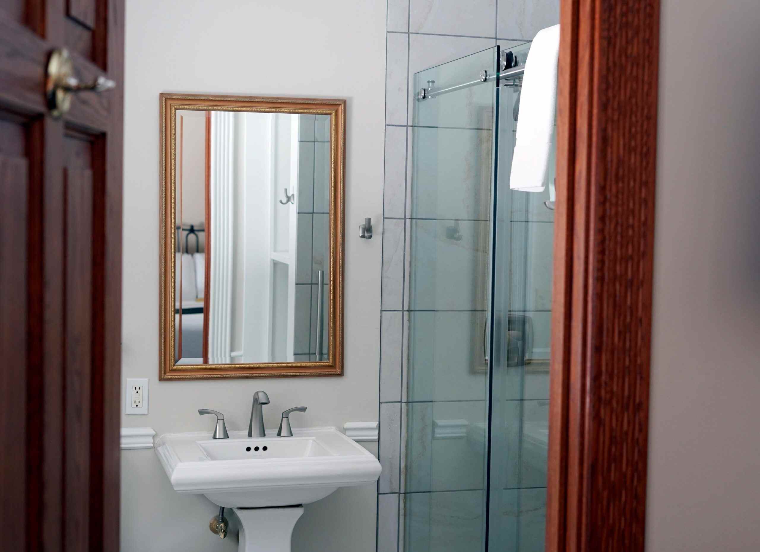 Capellaโs impressive four-post king bed is just the beginning of the space and comfort you will find during your stay. The comfortably elegant bathroom features a walk-in glass shower, charming pedestal sink and expansive shelving for all your toiletries.