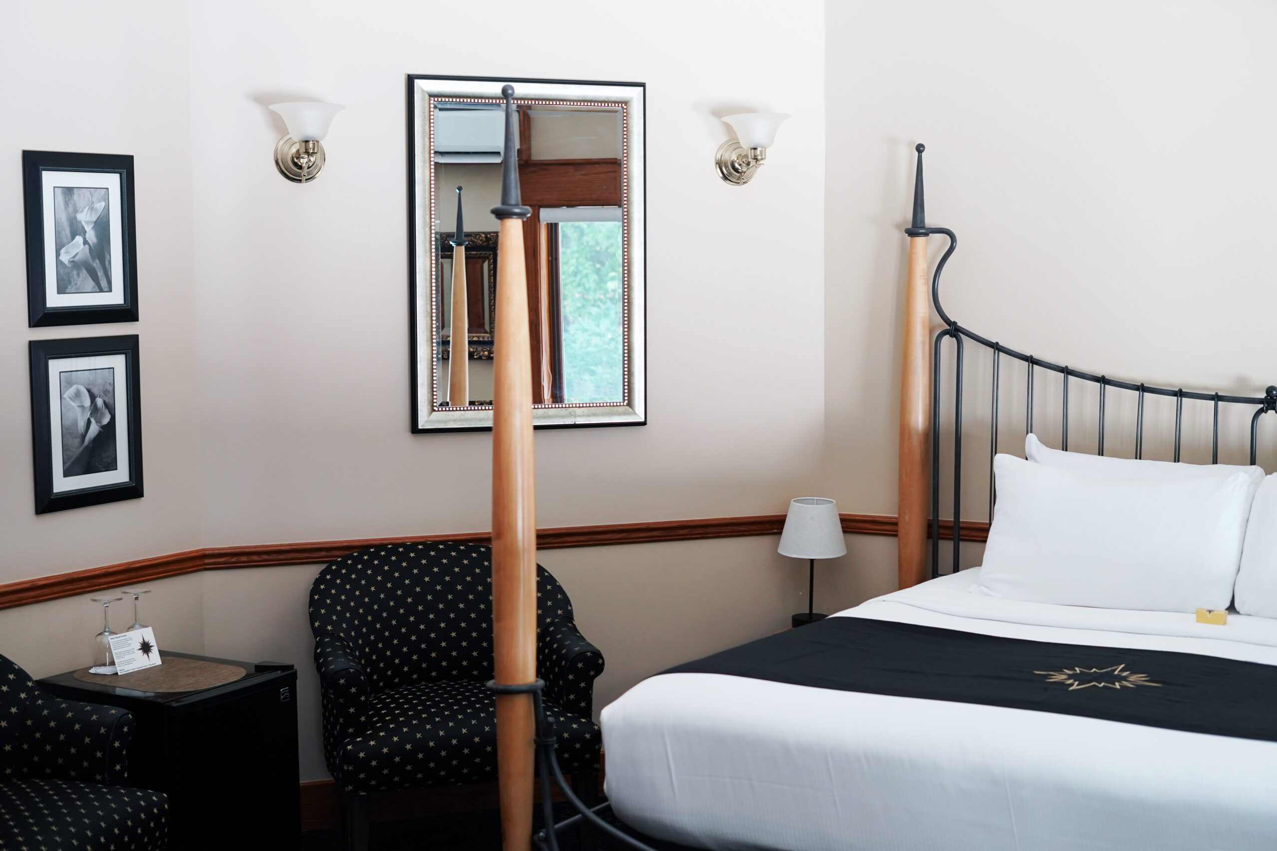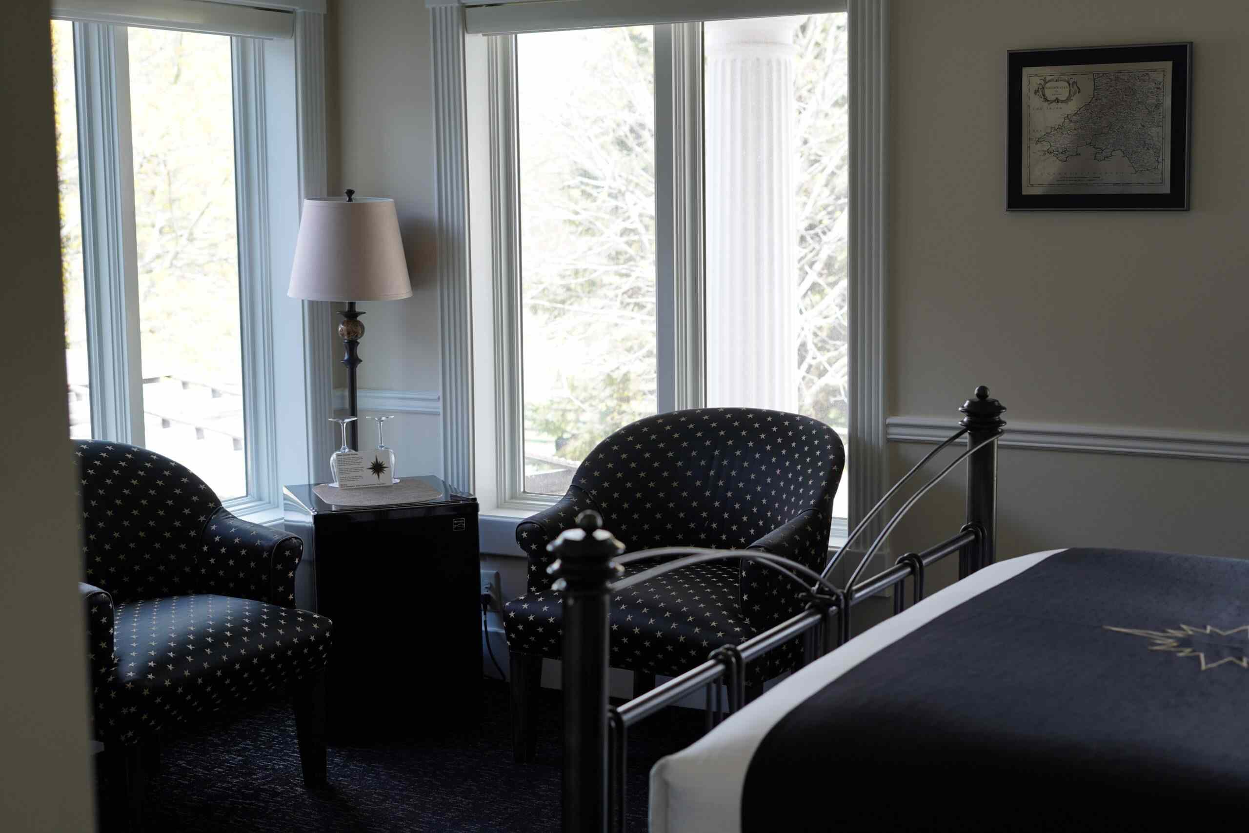 This room features a king bed and a comfortable sitting area with a view of the back woods and hidden garden, where deer are sometimes spotted at dusk. An exposed brick wall adds an urban element amid the classic furnishings. The spacious bathroom features modern fixtures and a walk-in shower.
