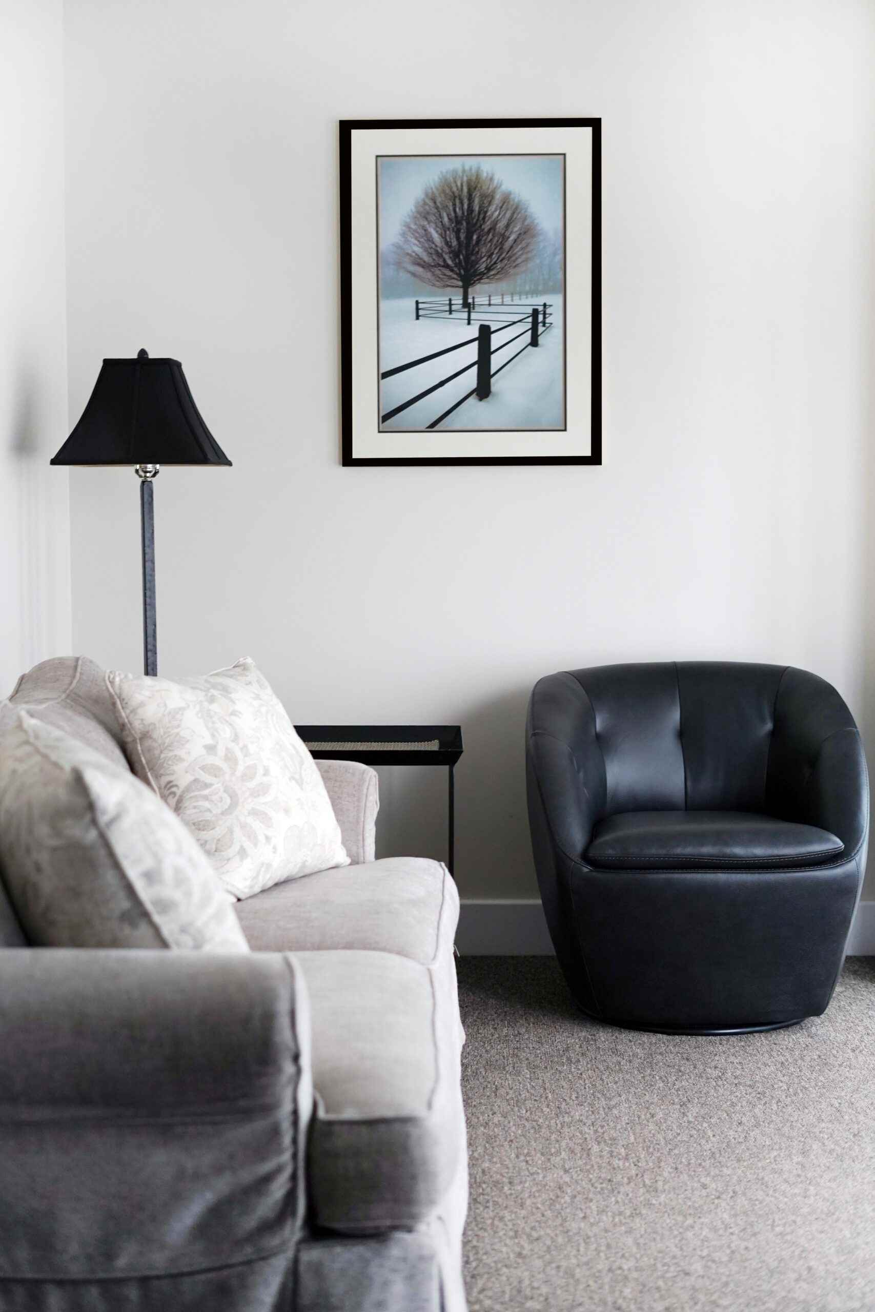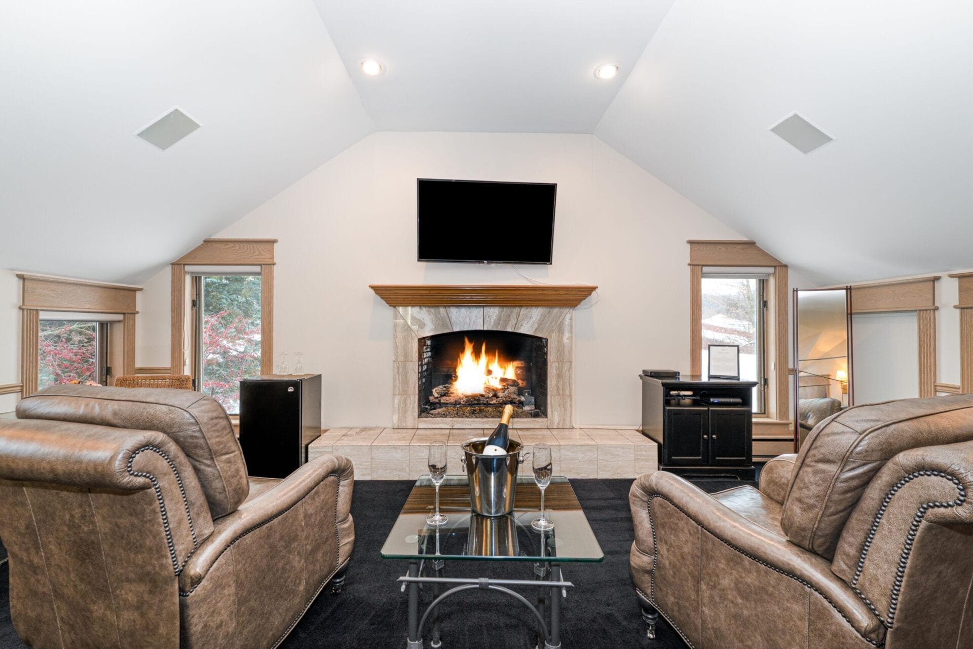 “A spacious, warm, and welcoming suite featuring a marble fireplace, comfortable lounge chairs, and close proximity to the Innโs relaxing steam sauna.โ