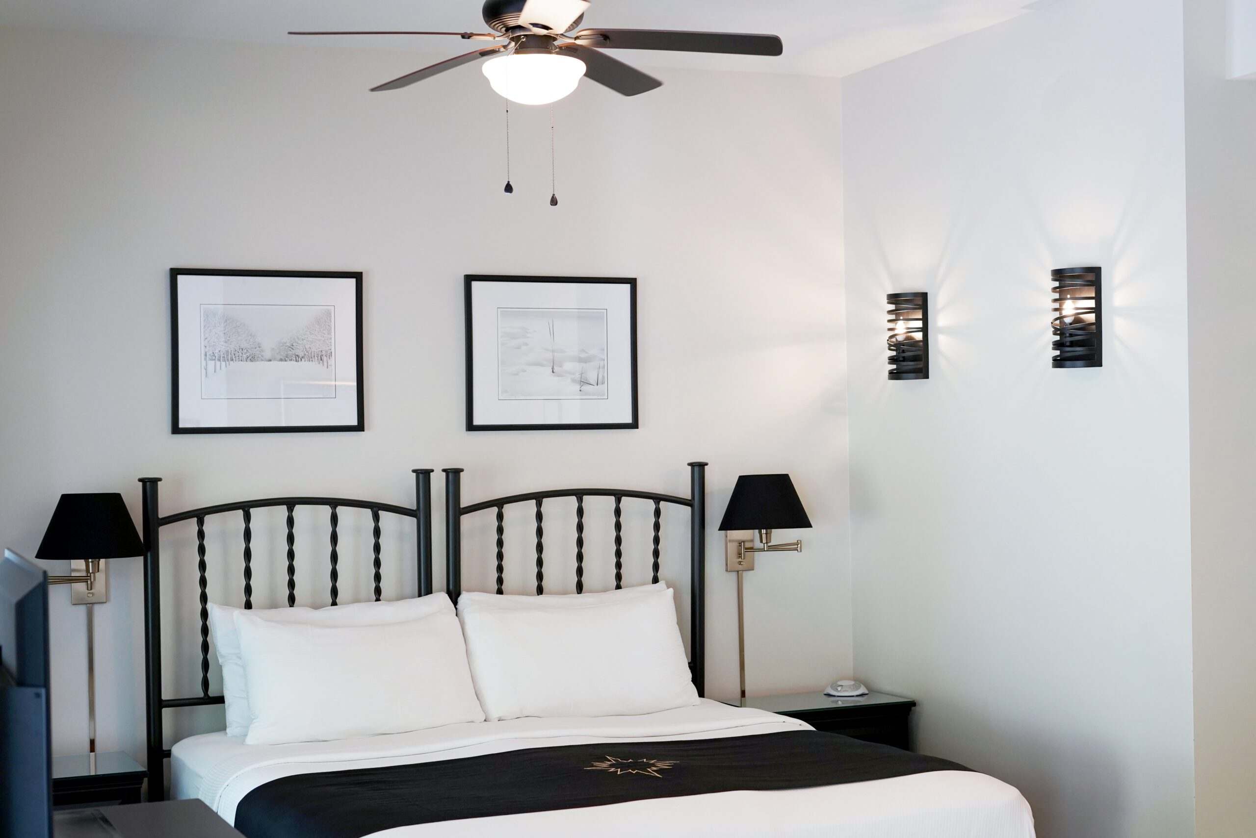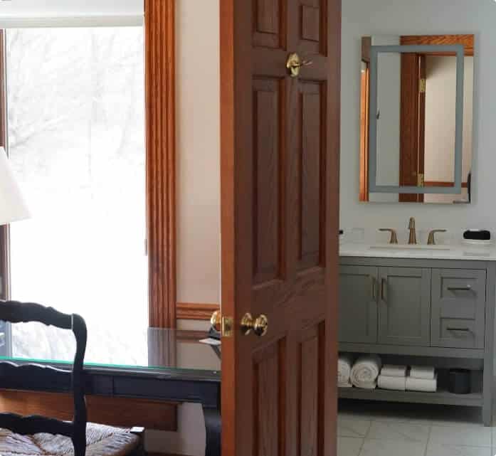 Indulge in the decadent urban-contemporary oasis that many call the โbest bathroom in the houseโ at Black Star Farms Bed and Breakfast in Traverse City, Michigan. A remodel in 2020 transformed this bathroom into a luxurious retreat with dual sinks, a walk-in custom tiled shower, and a freestanding soaking tub. Wake up in the newly appointed mid-century modern bedroom to sunrise views of the horse pastures and stables.