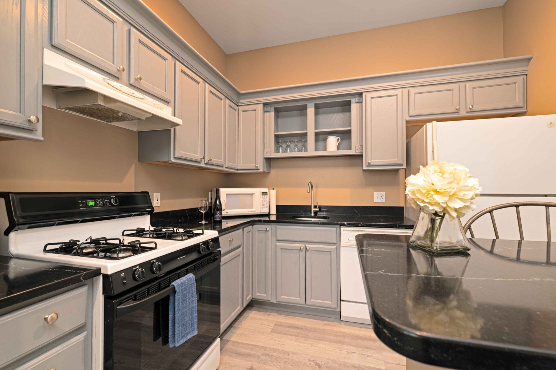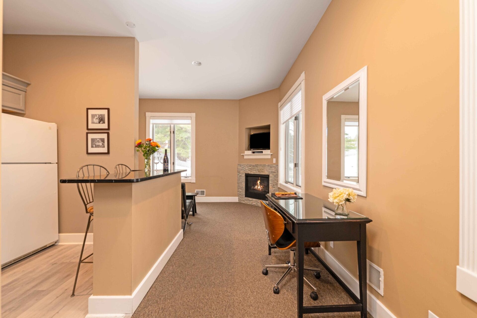 โA convenient ground-floor suite with a full kitchen, seating-area with fireplace, and a king bedroom offering direct access to exclusive private parking.โ