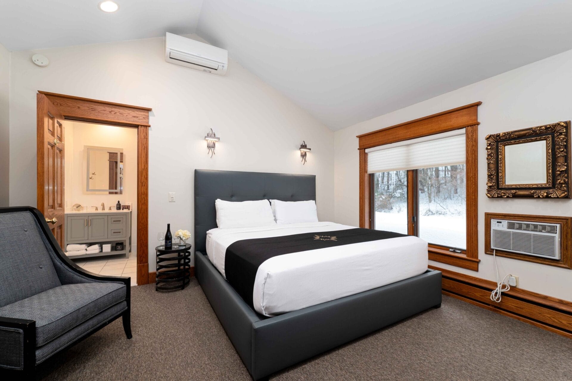 Tucked under the eaves with beautiful wooded views, our coziest room has an upgraded queen bed and new leather chair. The bathroom includes a tub/shower combination and a large vanity with plenty of storage underneath.