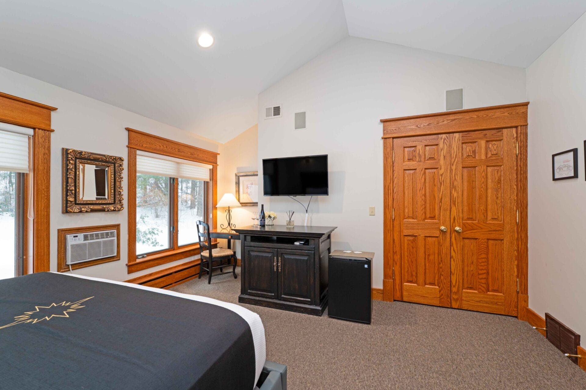 This spacious room provides a perfect launching point for exploring the Leelanau Peninsula. New features include a custom king bed and lounge chair and a bathroom with a walk-in shower. In addition, it has a desk tucked in a nook with forest views for those needing a quiet place to get some work done while on vacation.